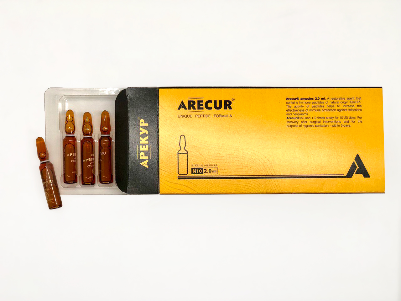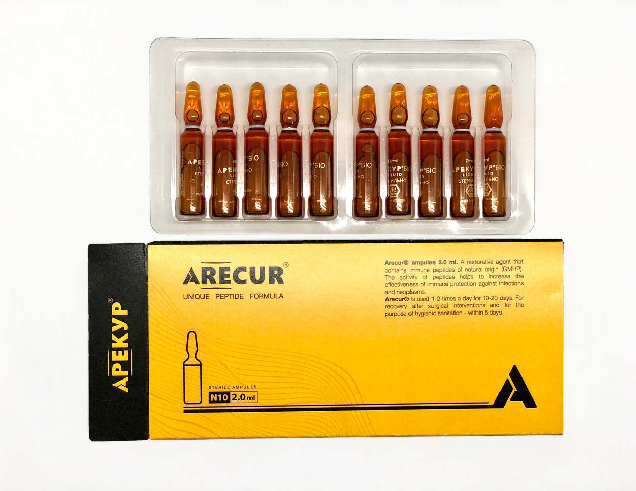 По 1 ампулі Арекур® в/м 1 раз на день вранці та по 1 супозиторію Арекур® 1 раз на день ввечері протягом 20 днів.