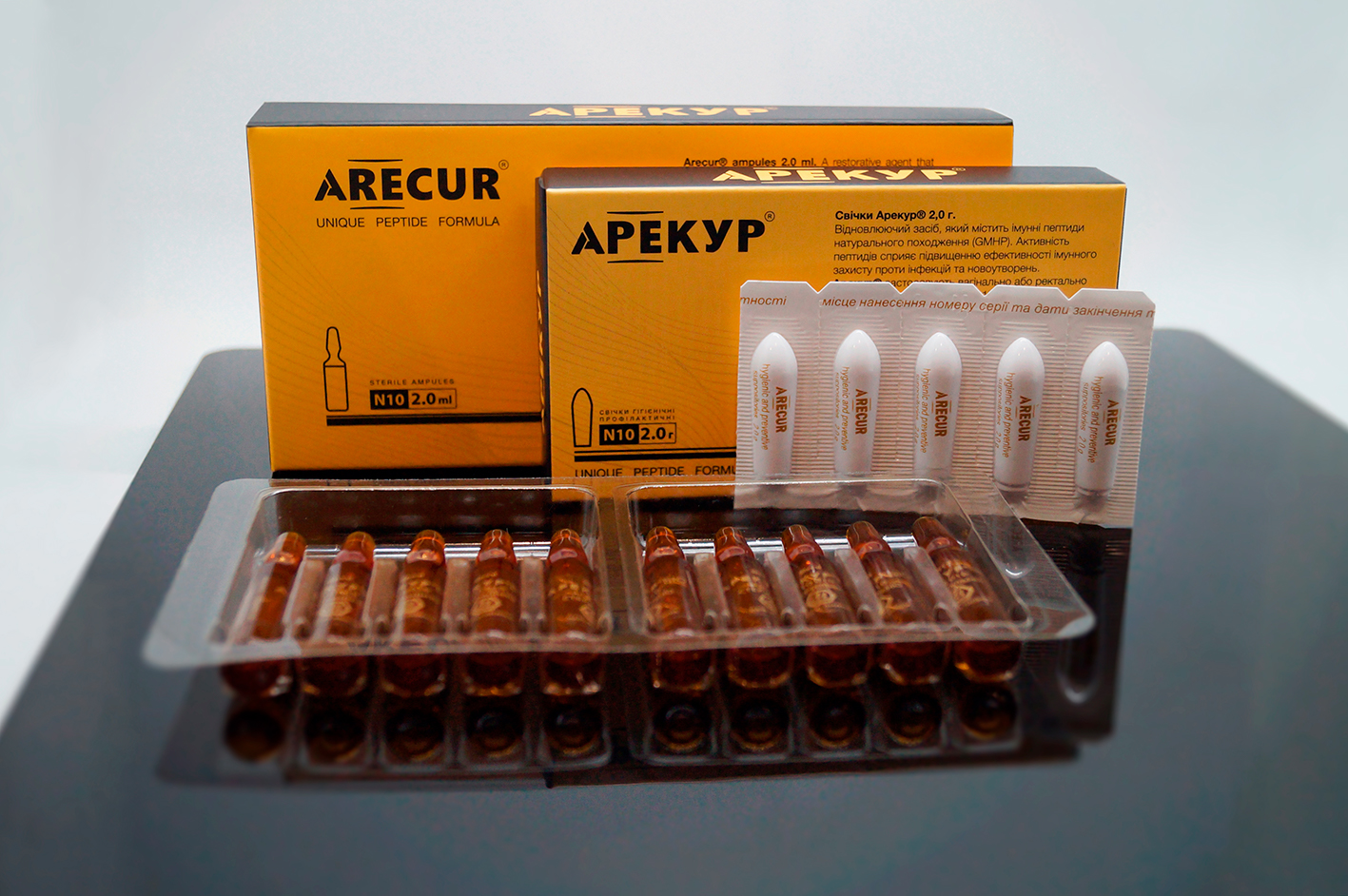 По 1 ампулі Арекур® в/м 1 раз на день вранці та по 1 супозиторію Арекур® 1 раз ввечері протягом 20 днів.