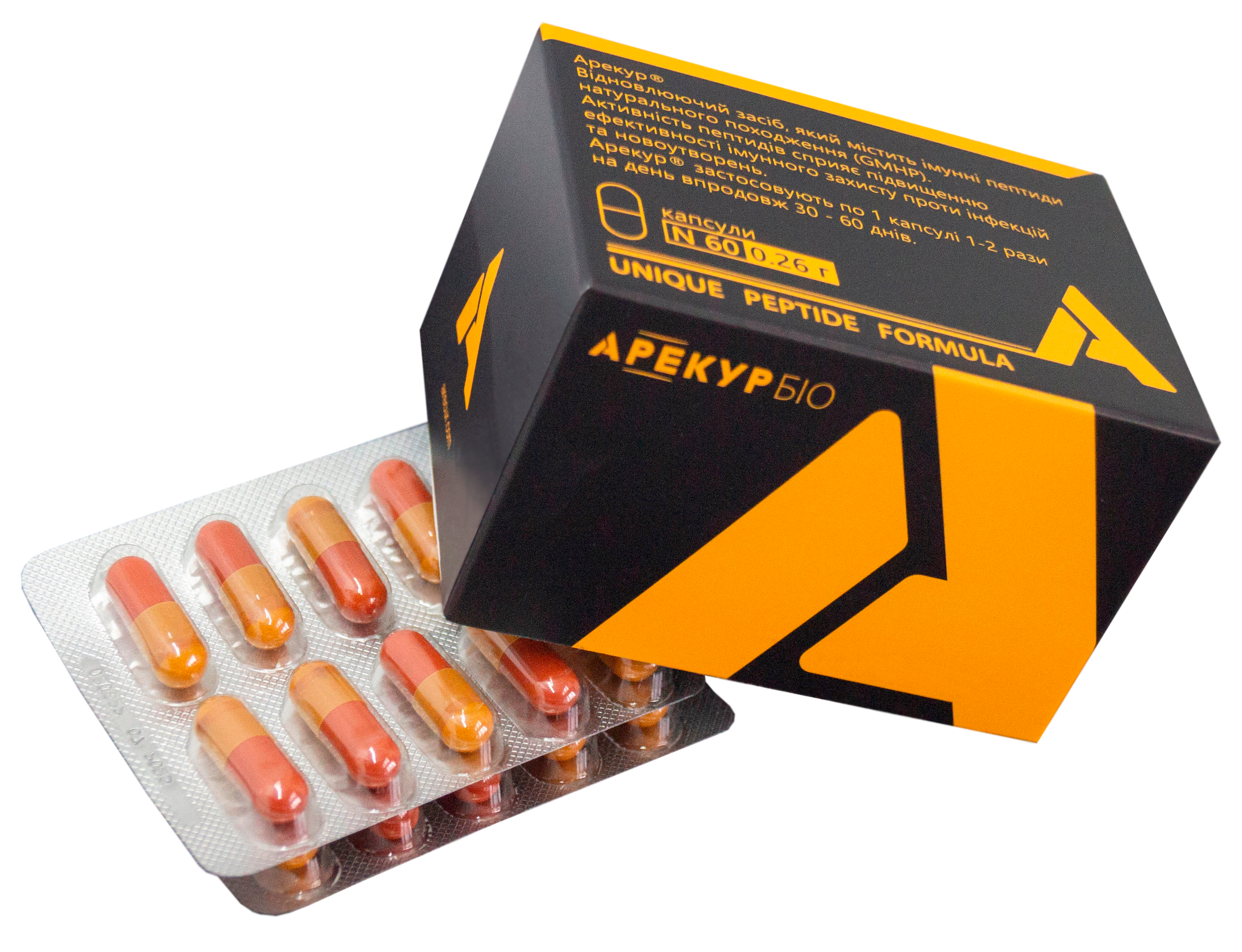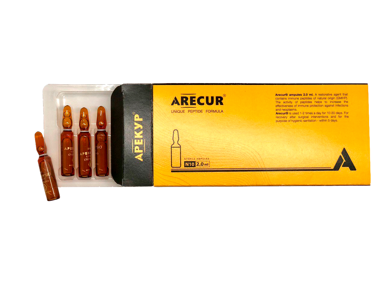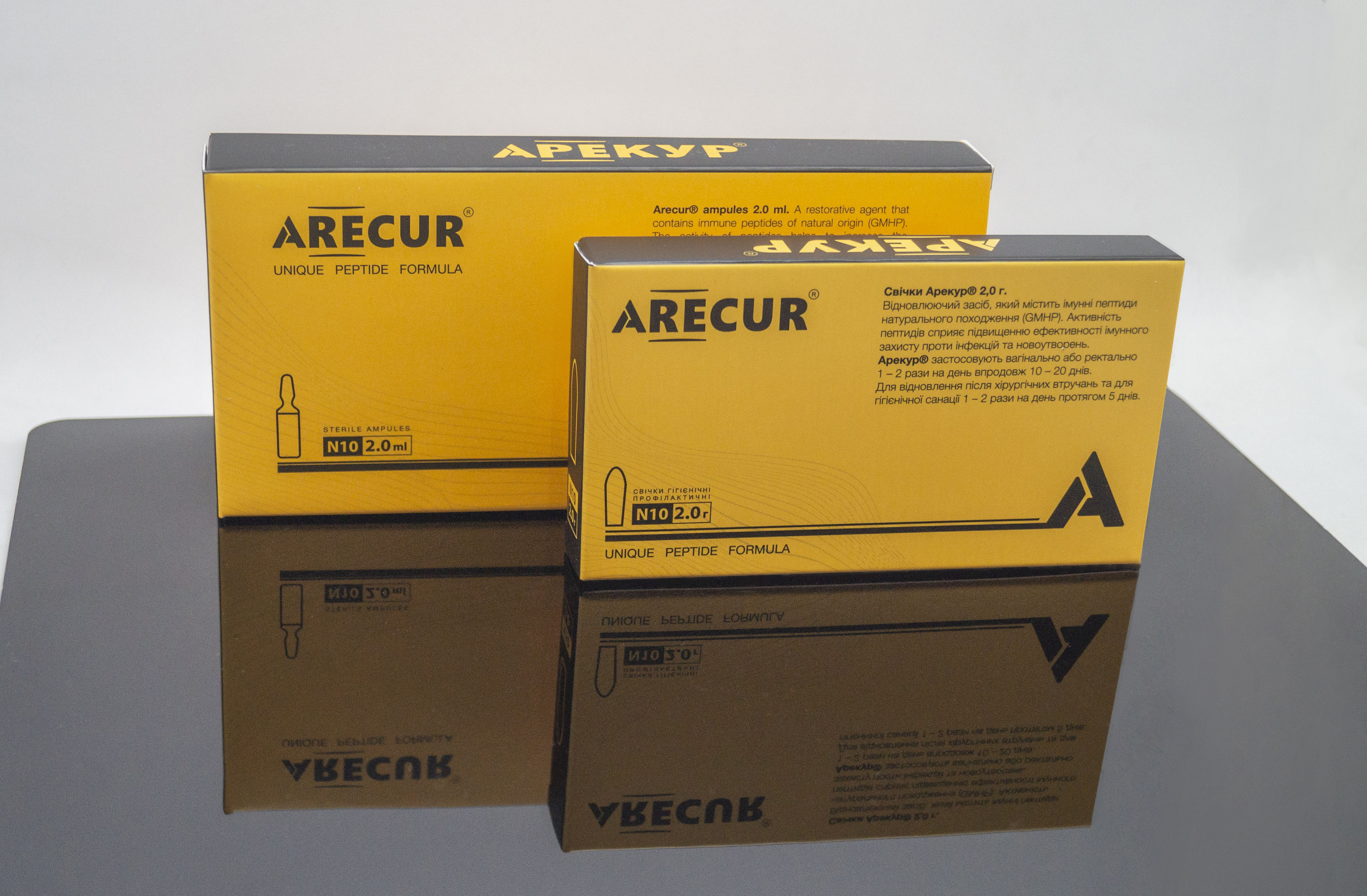 У комбінації з антибіотиками: по 1 ампулі Арекур® в/м  2 рази на день протягом 20 днів та по 1 капсулі Арекур® 2 рази на день протягом 60 днів